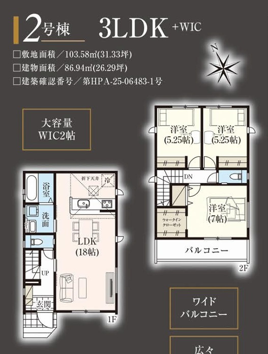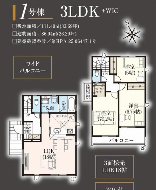 | 建物面積/坪数 | 86.94㎡ / 26.29坪 | 土地面積/坪数 | 111.40㎡ / 33.69坪 |