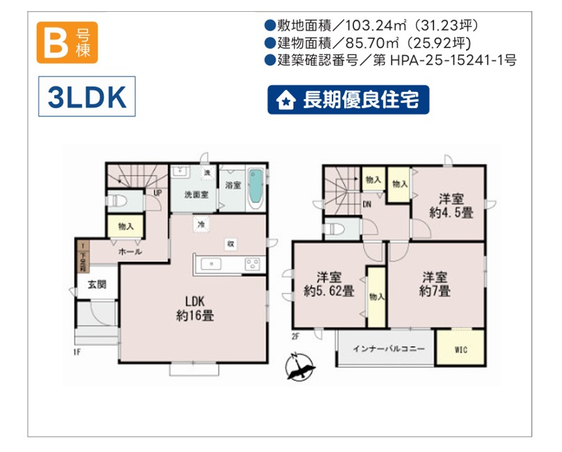 | 建物面積/坪数 | 85.70㎡ / 25.92坪 | 土地面積/坪数 | 103.24㎡ / 31.22坪 |