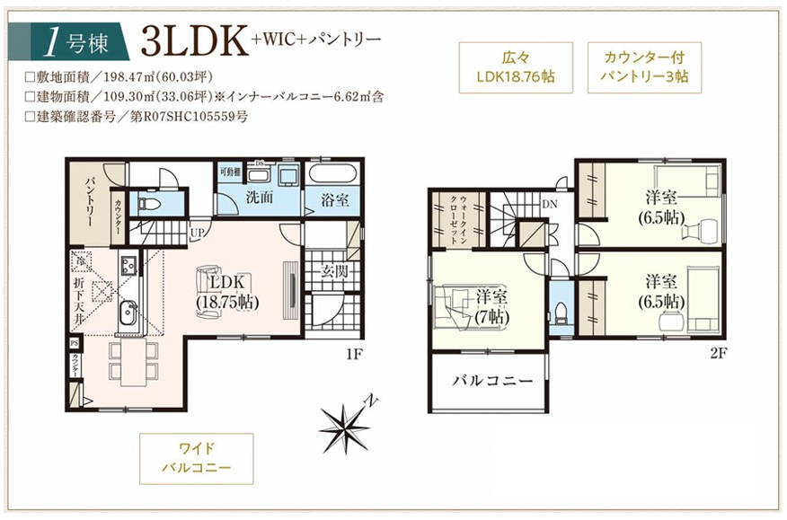 | 建物面積/坪数 | 109.30㎡ / 33.06坪 | 土地面積/坪数 | 198.47㎡ / 60.03坪 |